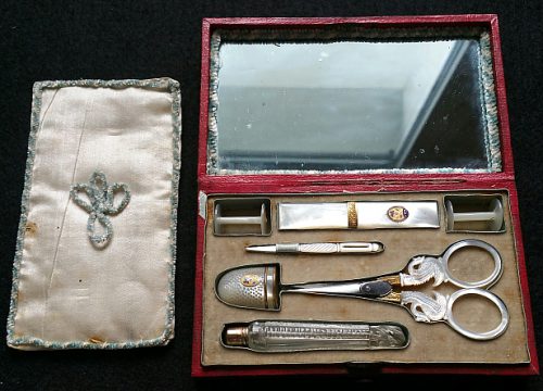 Petits écrins destinés aux travaux de couture et de broderie. Ils sont souvent des cadeaux d'étrennes. Beaucoup de ces articles de luxe sont vendus dans les enseignes prestigieuses du Palais Royal à Paris. Ornementés d'une pensée en or émaillé, ils sont le signe du luxe et des traditions de l'ancien régime.