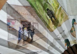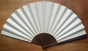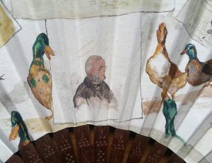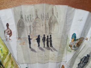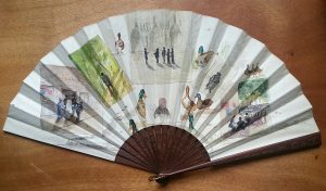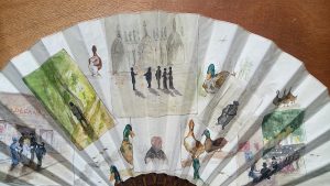 Rare éventail peint sur peau figurant la vie du Vicomte de Brossin de Méré 1873/1961.
