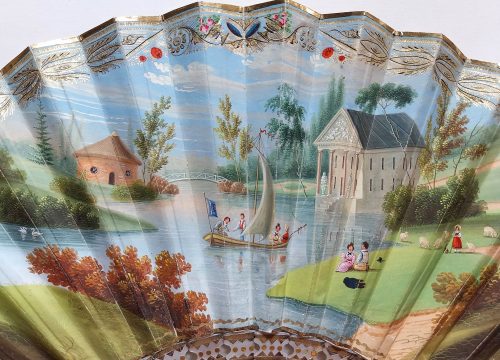 Éventail à feuille principale représentant une large scène peinte figurant une pièce d’eau dans un domaine de gentilhomme de style…