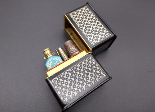 Petits écrins destinés aux travaux de couture et de broderie. Ils sont souvent des cadeaux d'étrennes. Beaucoup de ces articles de luxe sont vendus dans les enseignes prestigieuses du Palais Royal à Paris. Ornementés d'une pensée en or émaillé, ils sont le signe du luxe et des traditions de l'ancien régime.