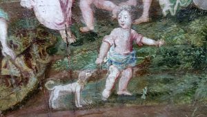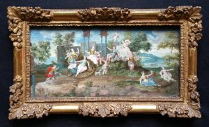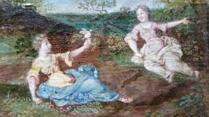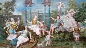 Huit femmes sont assises dans le parc d’un château classique. Entourées de putti, chien et colombes, elles accueillent à bras ouvert un jeune homme.