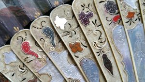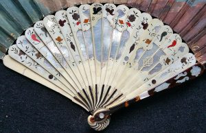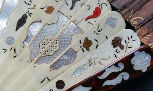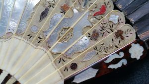 Les panaches, plaquées d’écaille sont incrustés de motifs en nacre, personnages et oiseaux.