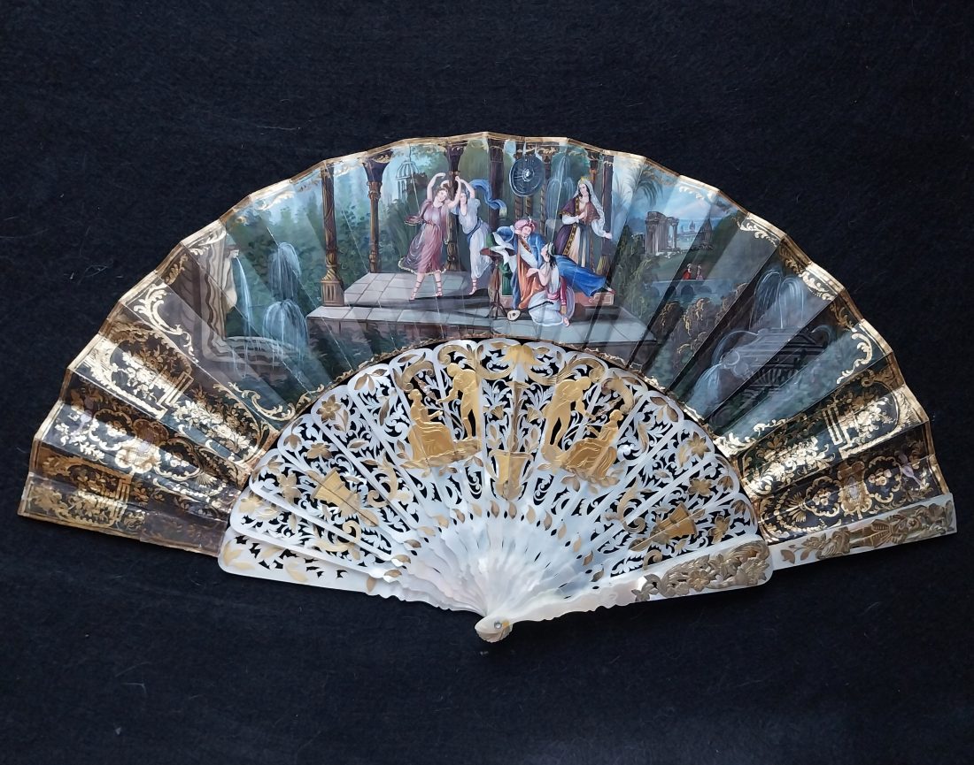 Éventail à double feuille en papier peint à la gouache et ornementé à l’or de médaillons fleuris. La face est composée d’un large cartel figurant une scène musicale de harem. Le revers représente une scène dans le goût de la Renaissance.