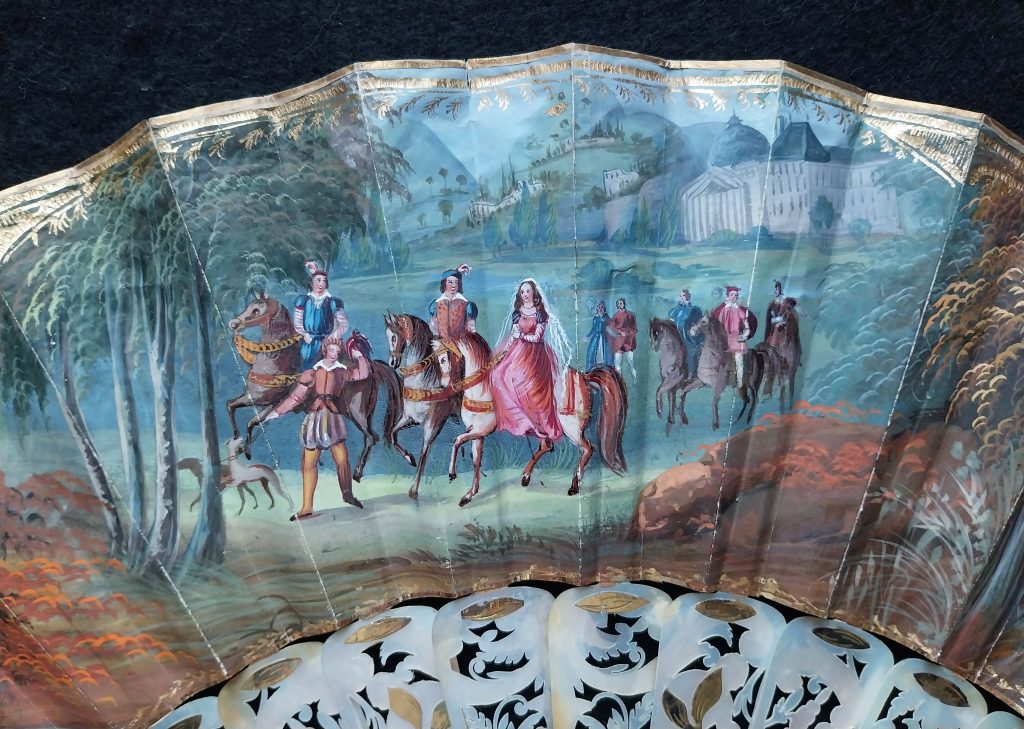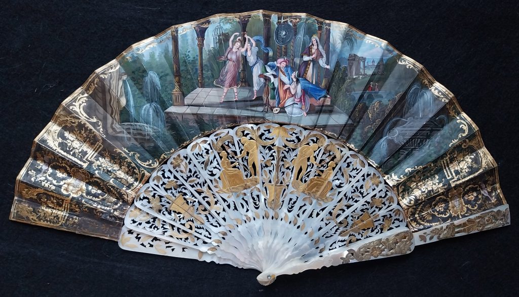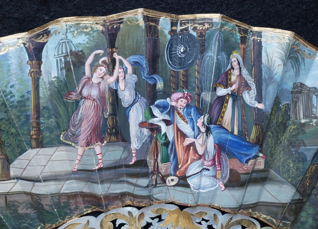 Éventail à double feuille en papier peint à la gouache et ornementé à l’or de médaillons fleuris. La face est composée d’un large cartel figurant une scène musicale de harem. Le revers représente une scène dans le goût de la Renaissance.
