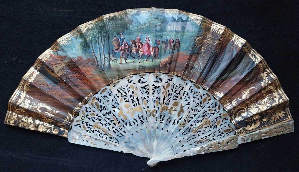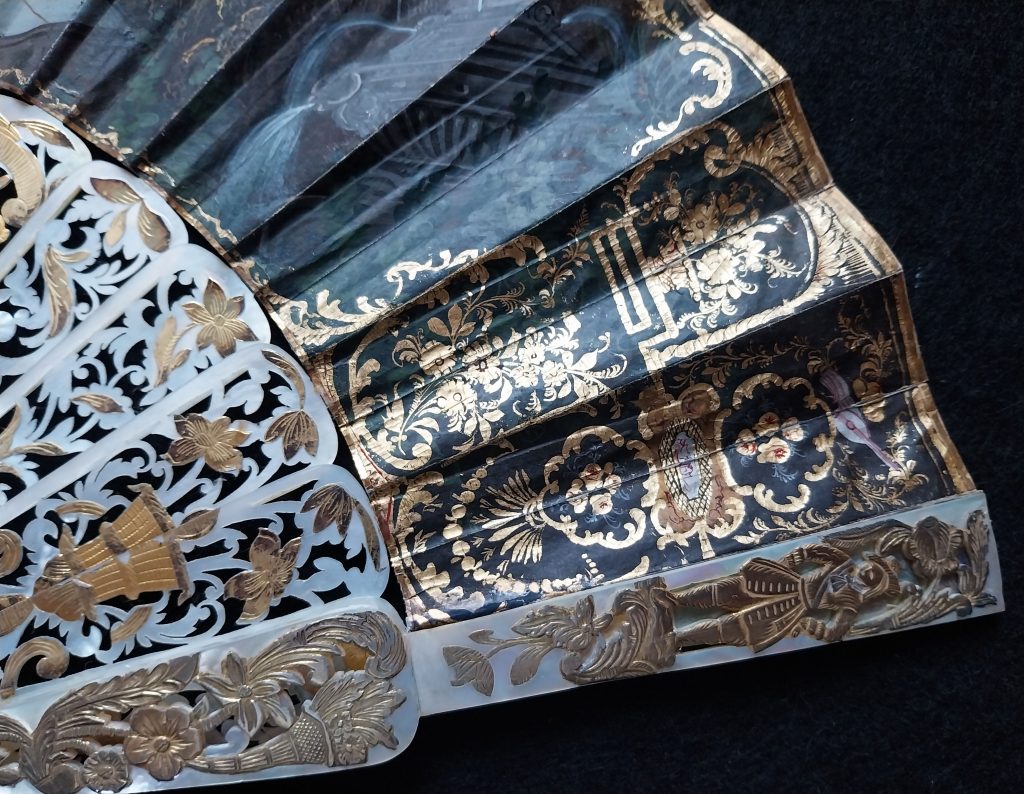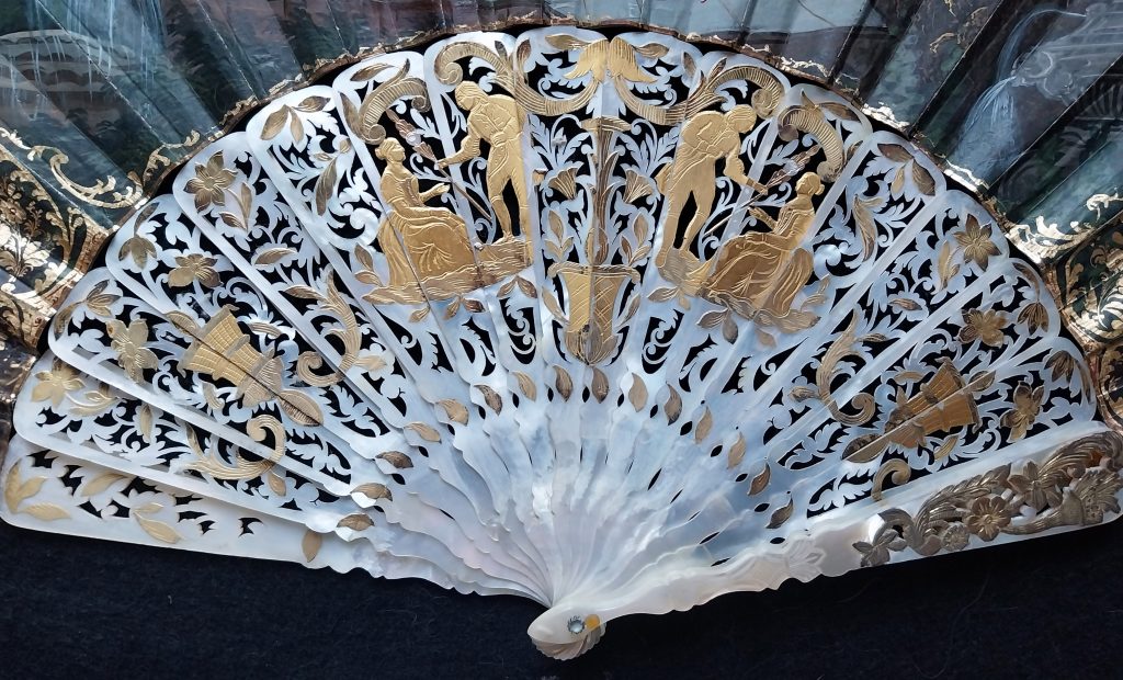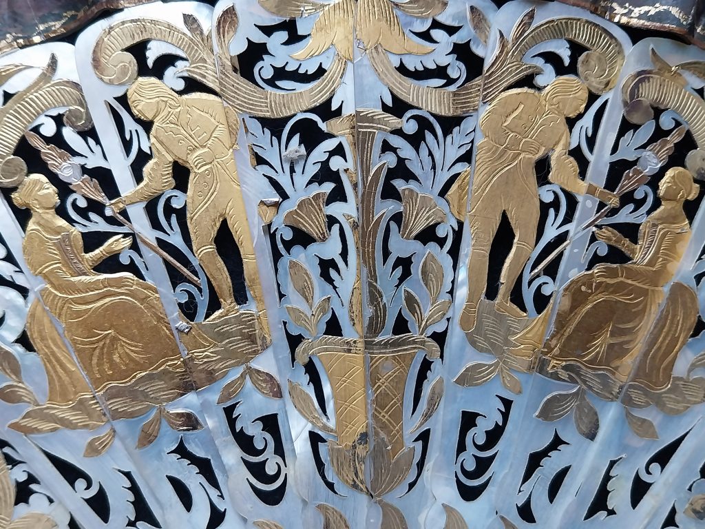Belle monture en nacre gravée, repercée et appliquée de feuilles d’or, figurant en symétrie un couple galant.