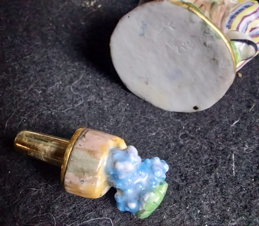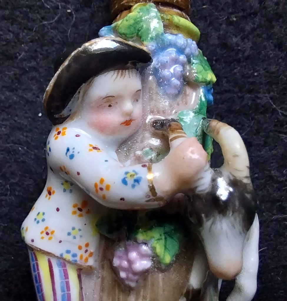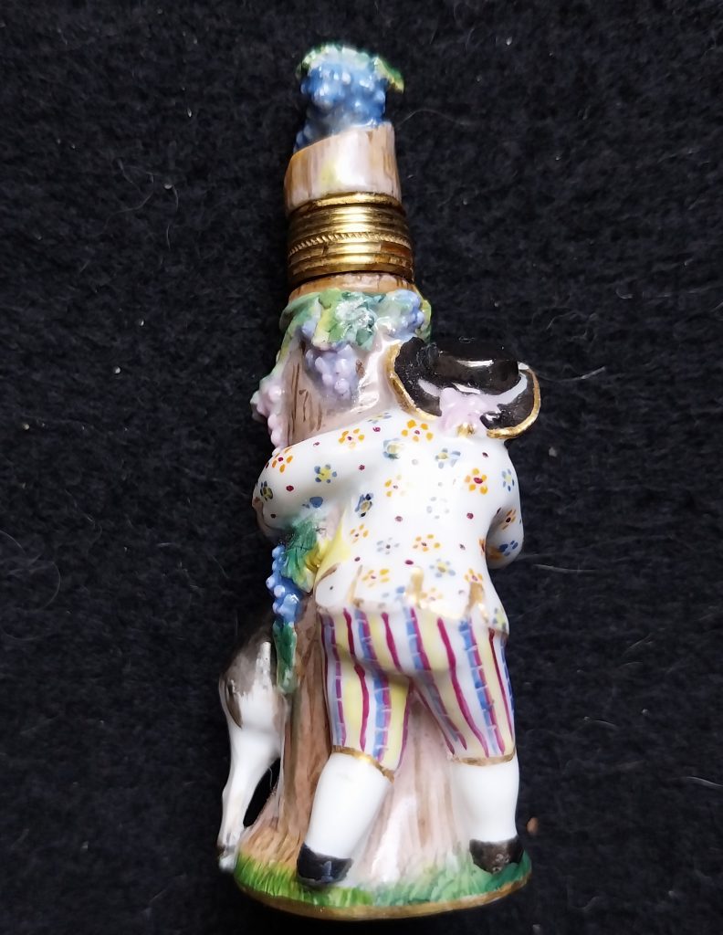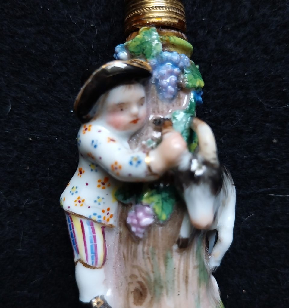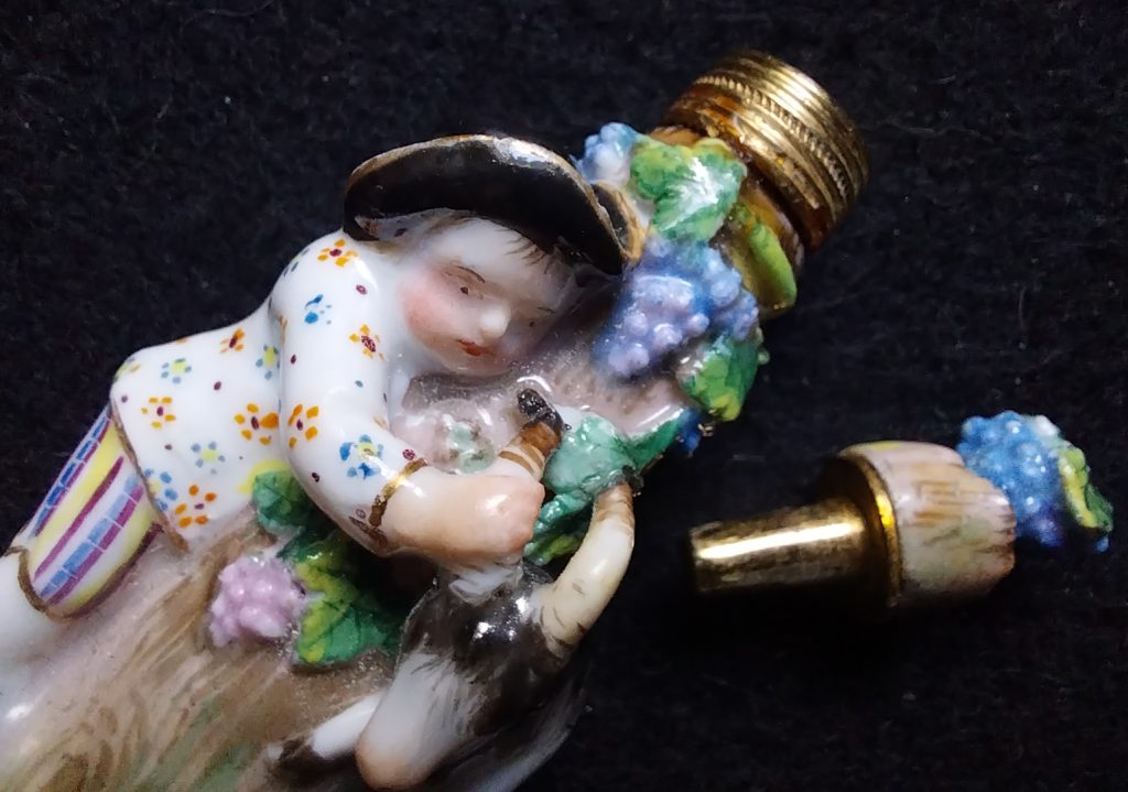 Petit flacon à parfum en porcelaine polychrome, monté en or. Il figure un enfant jouant avec une chèvre dans une sorte de cache-cache. Le bouchon et son stopper monté en or.