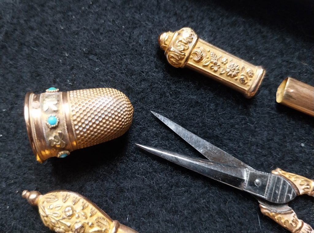 Très beau nécessaire de couture en or finement ciselé. Le dé en or 2 tons sertis de turquoises.