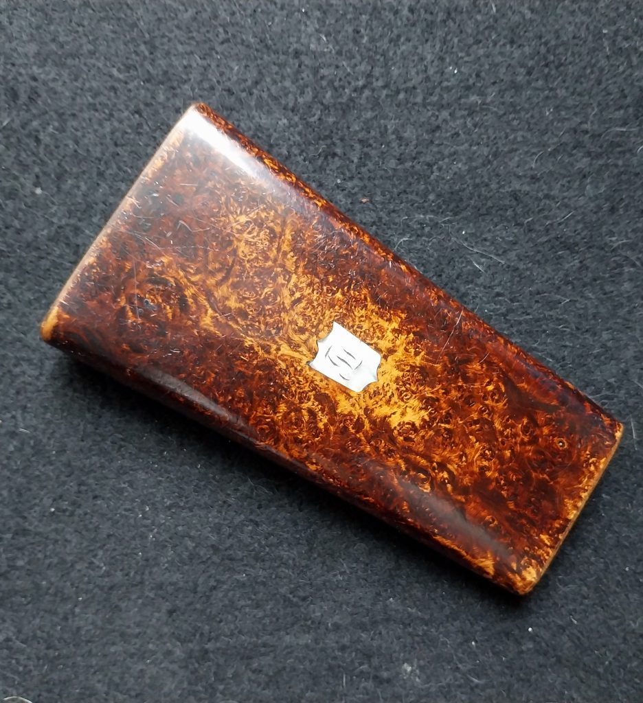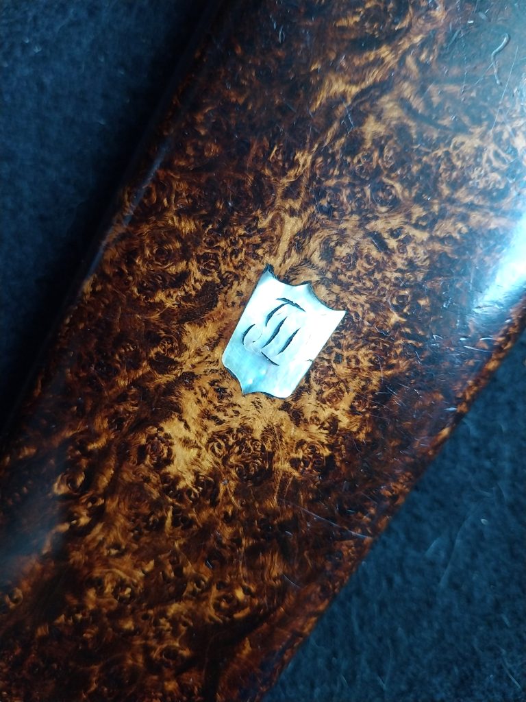 Dans son écrin en loupe de bois à l’imitation de l’écaille de tortue. Le couvercle présente une pièce de nacre gravé d’un monogramme.